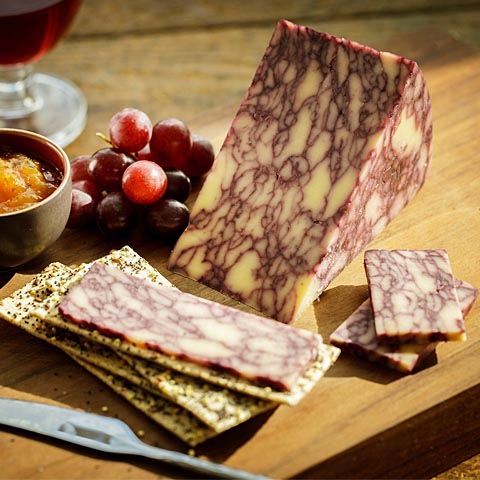 ポートワインが練りこまれた、ワイン色とアイボリー色のマーブル模様が美しいチーズです。チーズのミルキーな香りとワインのフルーティな香りが混ざり合い、とても魅力的な味わい。綺麗な色合いを活かして、プレートにしてワインと、またティータイムに紅茶と一緒に合わせるがおすすめです。