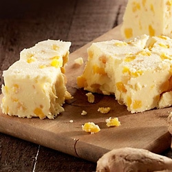- イギリスを代表するチーズ、スティルトンはブルーチーズですが、これは青カビを入れずに作った「ホワイトスティルトン」。ややもろもろとした生地の中に、ドライマンゴーとジンジャーを加えました。マンゴーのトロピカルな甘さとジンジャーのさわやかさ、クリーミーなチーズのハーモニーは他にはない味わいです。食後のデザートとして紅茶と合わせて。また、フルーティな白、赤ワインやスパークリングワインと合わせるのもおすすめです。